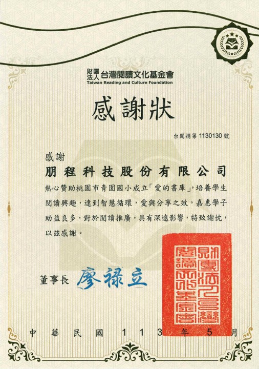朋程科技一直以來致力於回饋社會,尤其重視教育領域的公益活動,希望能給予孩童更多的學習機會和成長資源。桃園市中壢區青園國小是一所新成立的小學,這所小學目前尚未有適切的圖書館;為了讓孩子們擁有一個充滿愛與知識的閱讀空間,我們捐贈了20萬元支持青園國小建置「愛的書庫」!