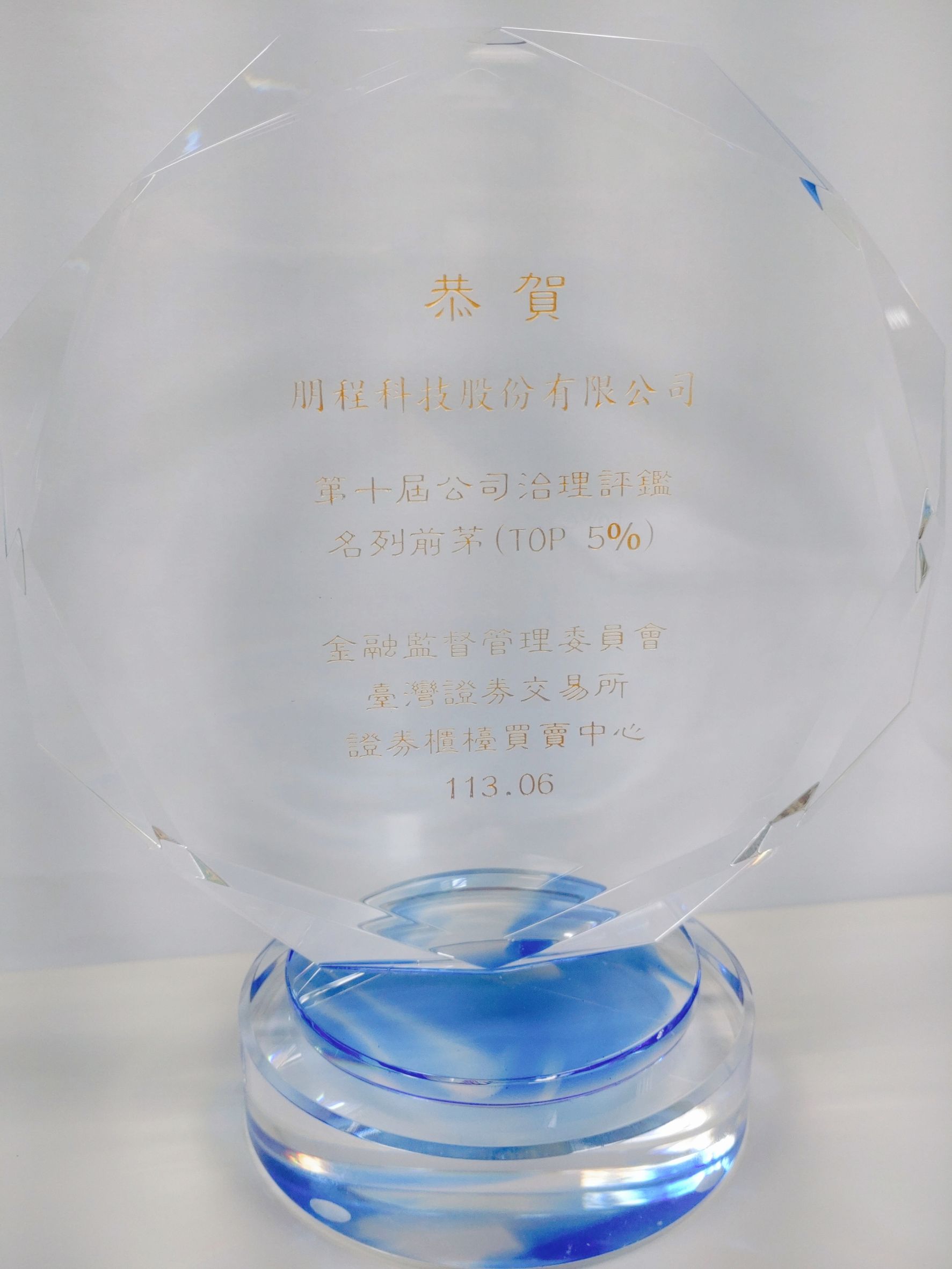 第十屆公司治理評鑑結果出爐,頒獎典禮於6月13日於台北喜來登飯店隆重舉行。在此次評鑑中,共有754家上櫃公司參與,朋程科技再次脫穎而出,連續九年榮獲上櫃組前5%的殊榮。